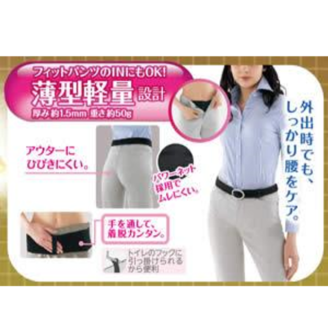 薄型軽量設計(薄さ約1.5mm、重さ約50g)のスリムなベルトでアウターにひびきにくく、フィットパンツのINにもOK。パワーネット採用でムレにくい。手を通してカンタンに着脱でき、トイレのフックにも引っ掛けられる便利な設計。