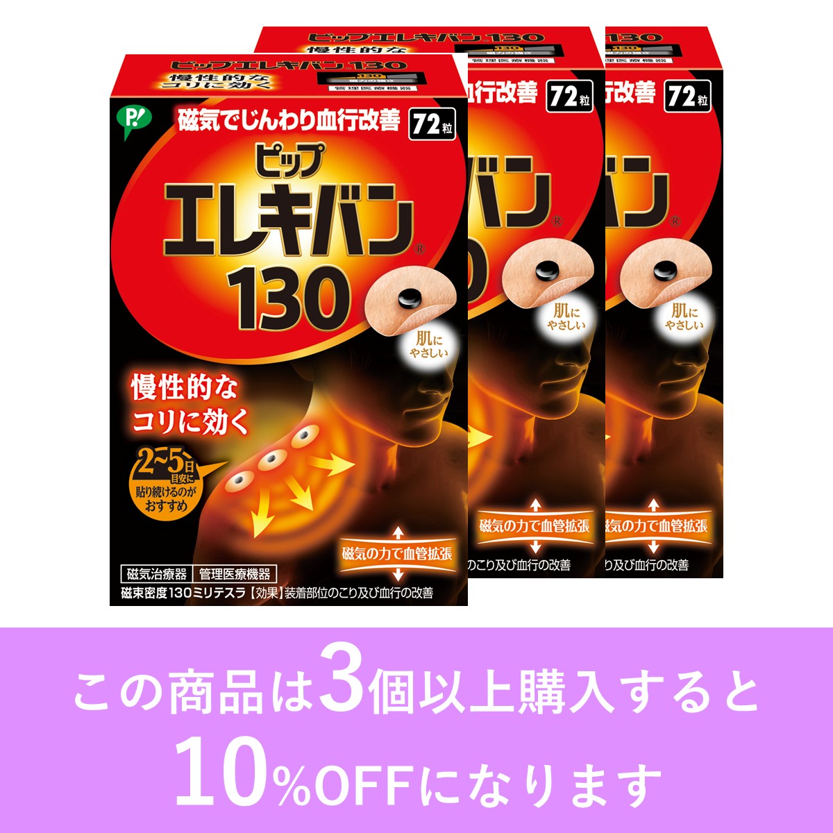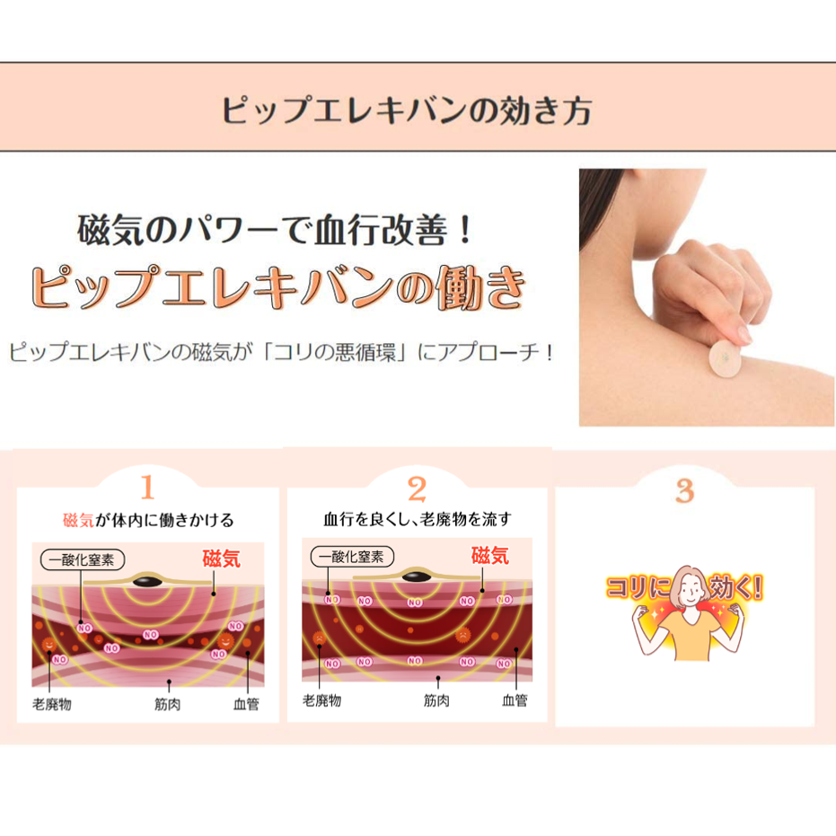 ピップエレキバンの磁気は、体内成分に働きかけて筋肉内の血行を良くし「老廃物」を流すことでコリの悪循環にアプローチし、コリをほぐします。