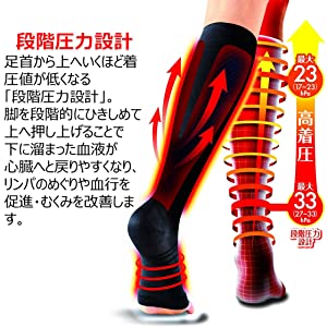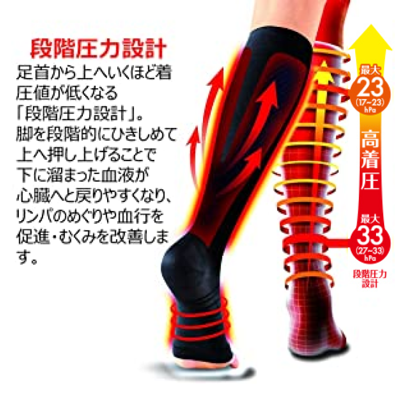 足首から上へいくほど着圧値が低くなる「段階圧力設計」。脚を段階的にひきしめて上へ押し上げることで下に溜まった血液が心臓へと戻りやすくなり、血行を促進・むくみを改善します。