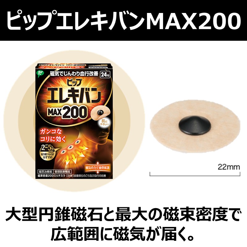 の4種類があり、数字はそれぞれの磁束密度をあらわしています。また、ピップエレキバンfor mamaは、MAX200と同じ磁束密度で、バンソウコウから透けにくいカラーの磁石を使用している製品です。