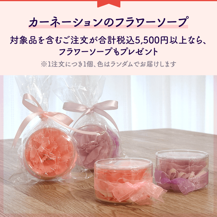 さらに対象品を含むご注文が合計税込5,500円以上のお客様には、メッセージカードと一緒にフラワーソープをお届けいたします。