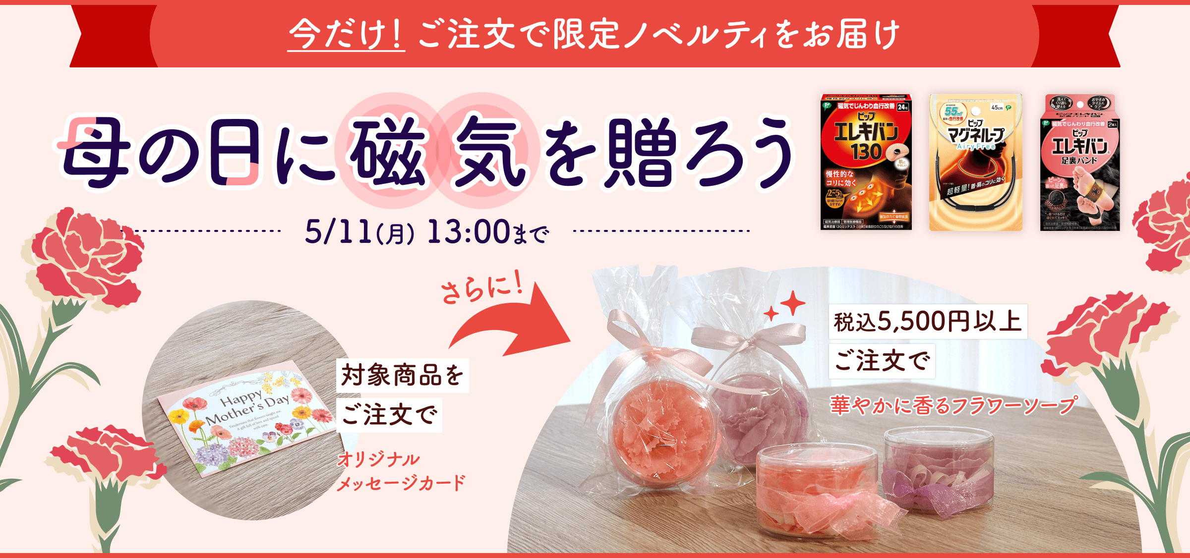 ただいま 母の日に磁気を贈ろうキャンペーン を実施中!期間中の注文で限定ノベルティを一緒にお届けいたします。この機会にぜひご利用ください♪