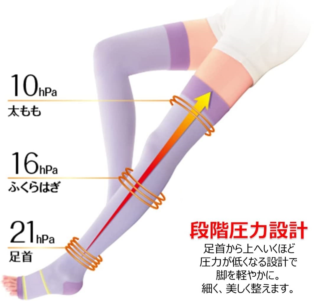 足首から上へいくほど圧力が低くなる設計で、脚を細く、美しく整えます。