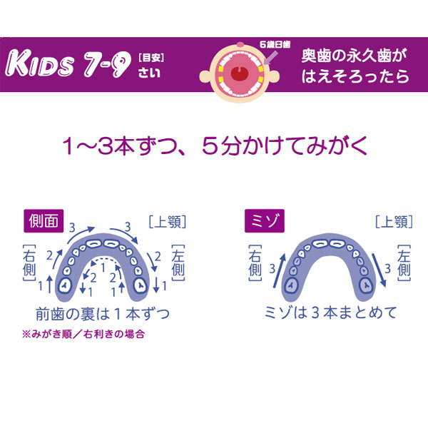 上の歯の利き手側から、歯の外側・内側・ミゾの順に前歯の内側と6歳臼歯は1本、その他奥歯は2本、前歯の外側は3本ずつ、1カ所10回程度、優しく動かしながらみがきます。