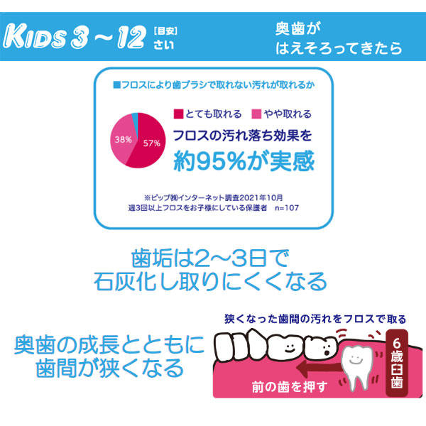 毎食後のフロスが理想的ですが、お子様の習慣づけとしてまずは一日一回、夕食後や就寝前の歯みがき時から始めてみて下さい。