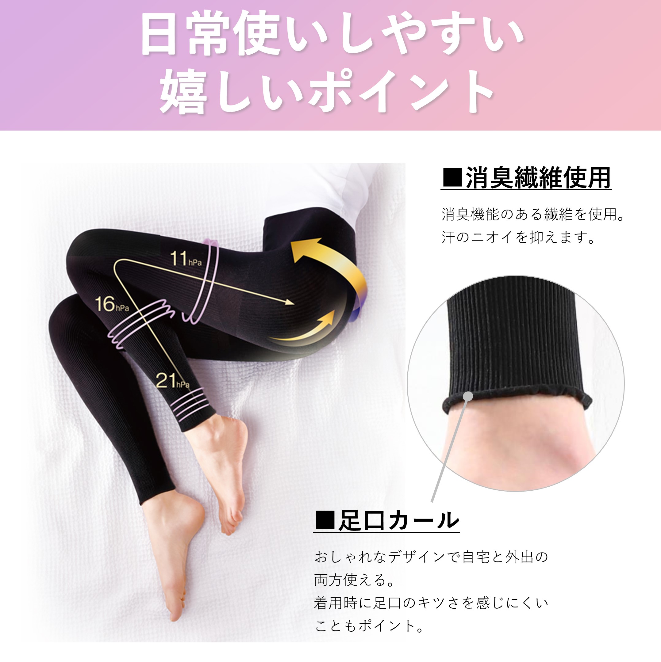 足首から上へいくほど圧力が低くなる設計で、脚を細く、美しく整えます。