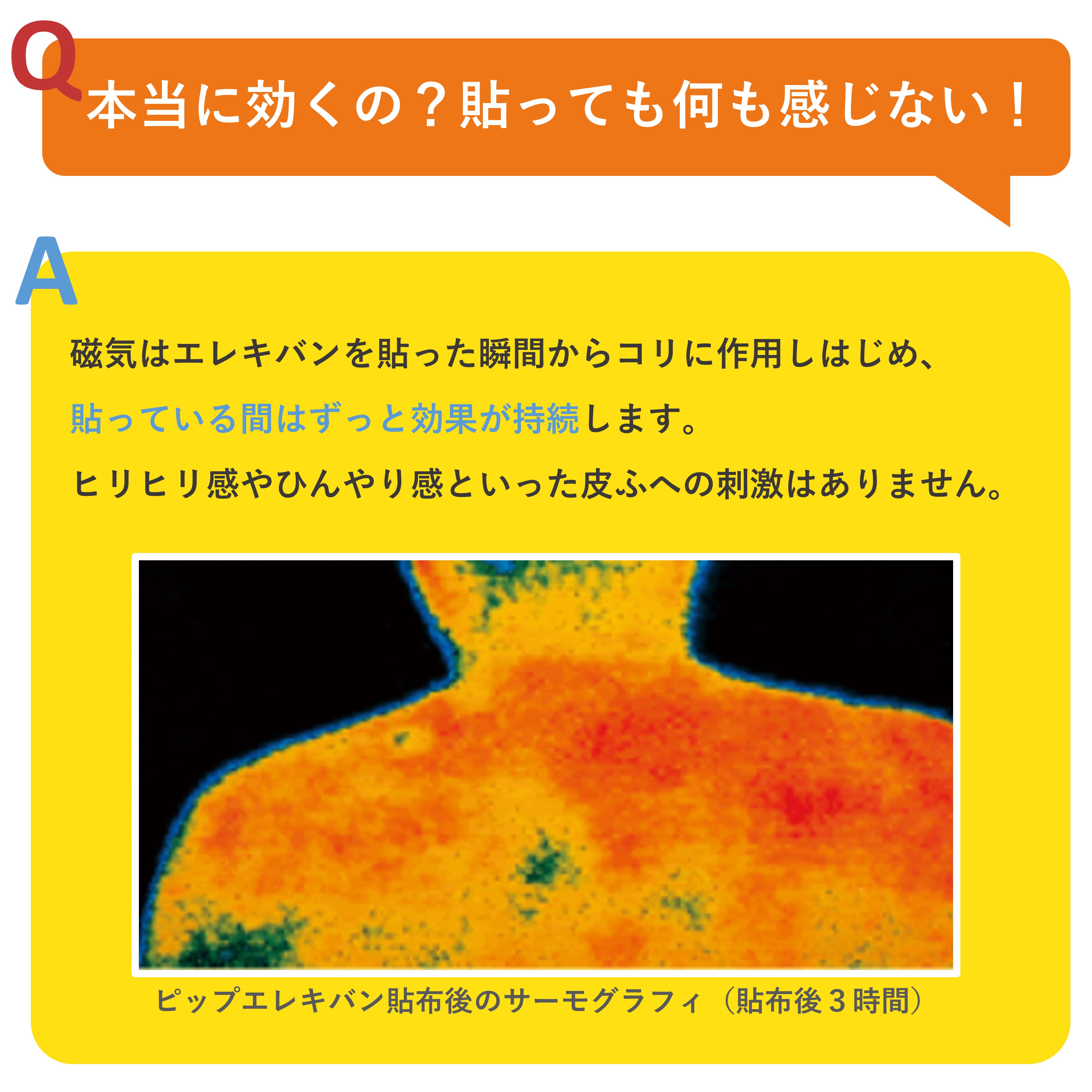 ピップエレキバンは、磁気が貼った瞬間からコリのある部位に作用し始めます。ヒリヒリ感やひんやり感といった皮ふへの刺激はありません。