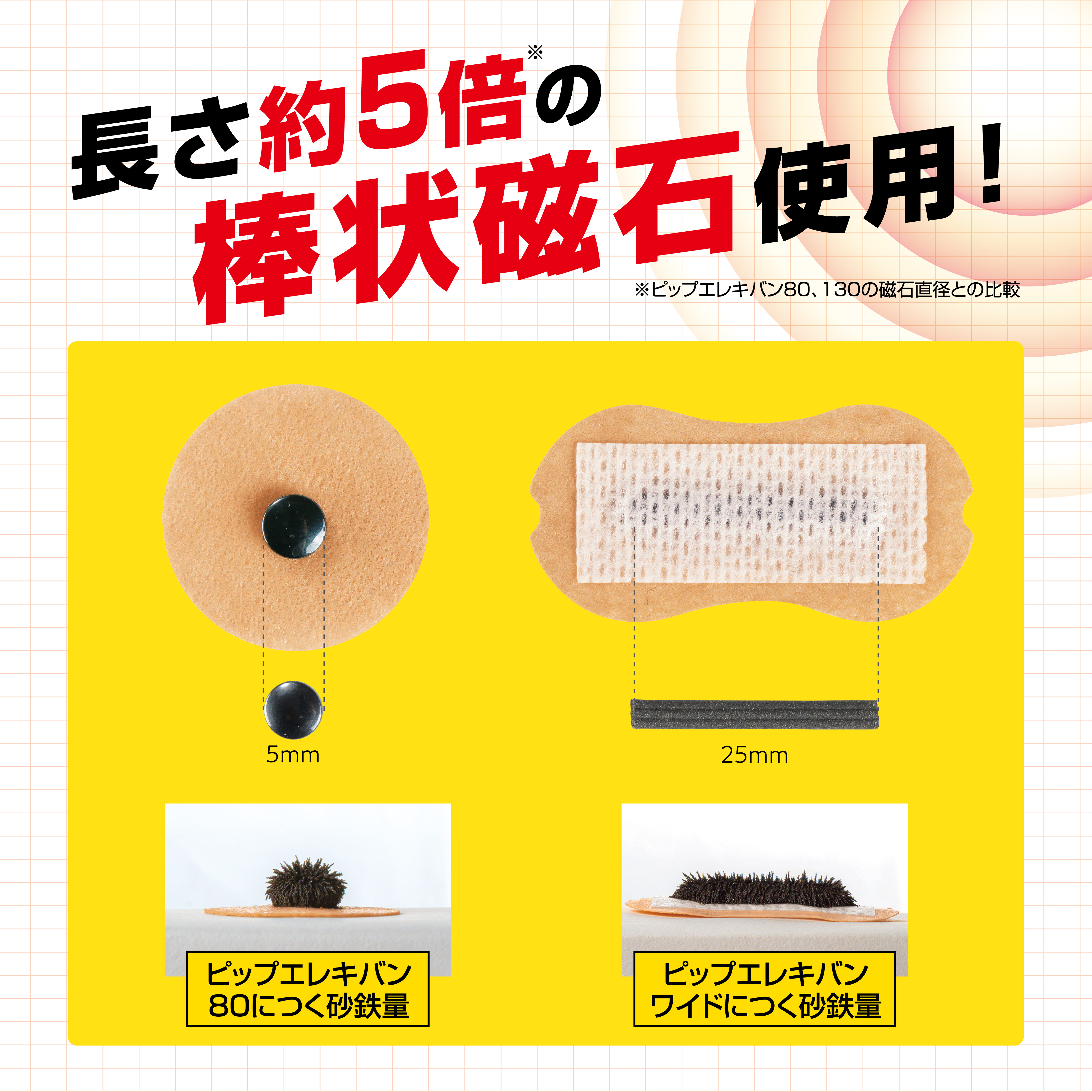 ピップエレキバン初の棒状磁石を採用。一枚で広く磁力が浸透するので広範囲にコリを感じる方、コリのポイントが見つけにくい方におススメです。