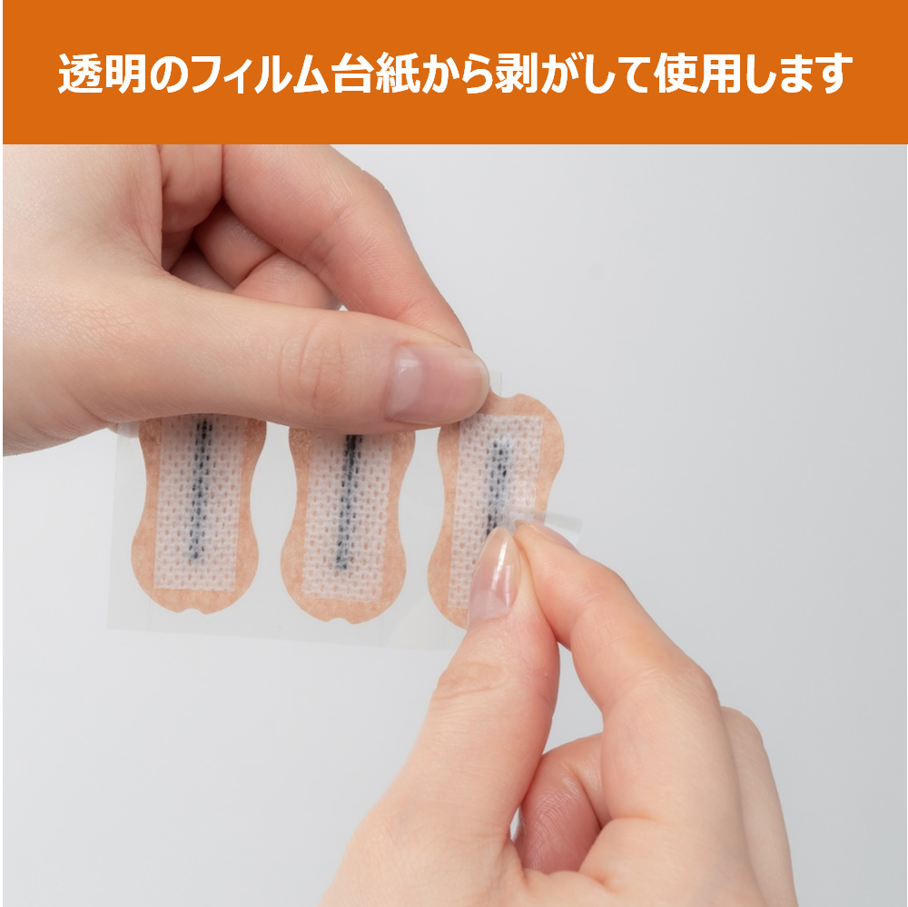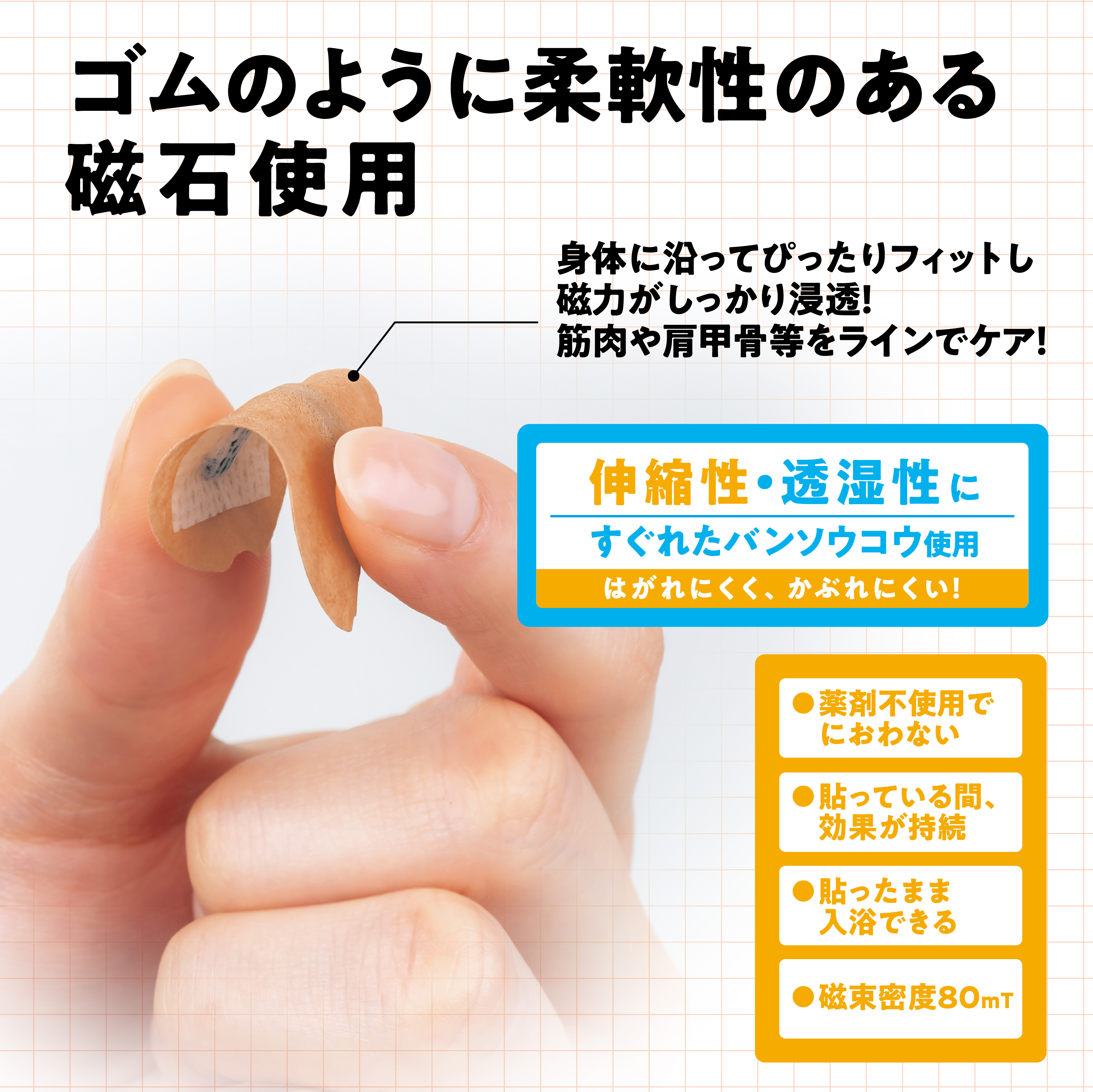 棒状磁石が付いた縦長のバンソウコウは肩甲骨付近や背中側にも貼りやすい形状です。