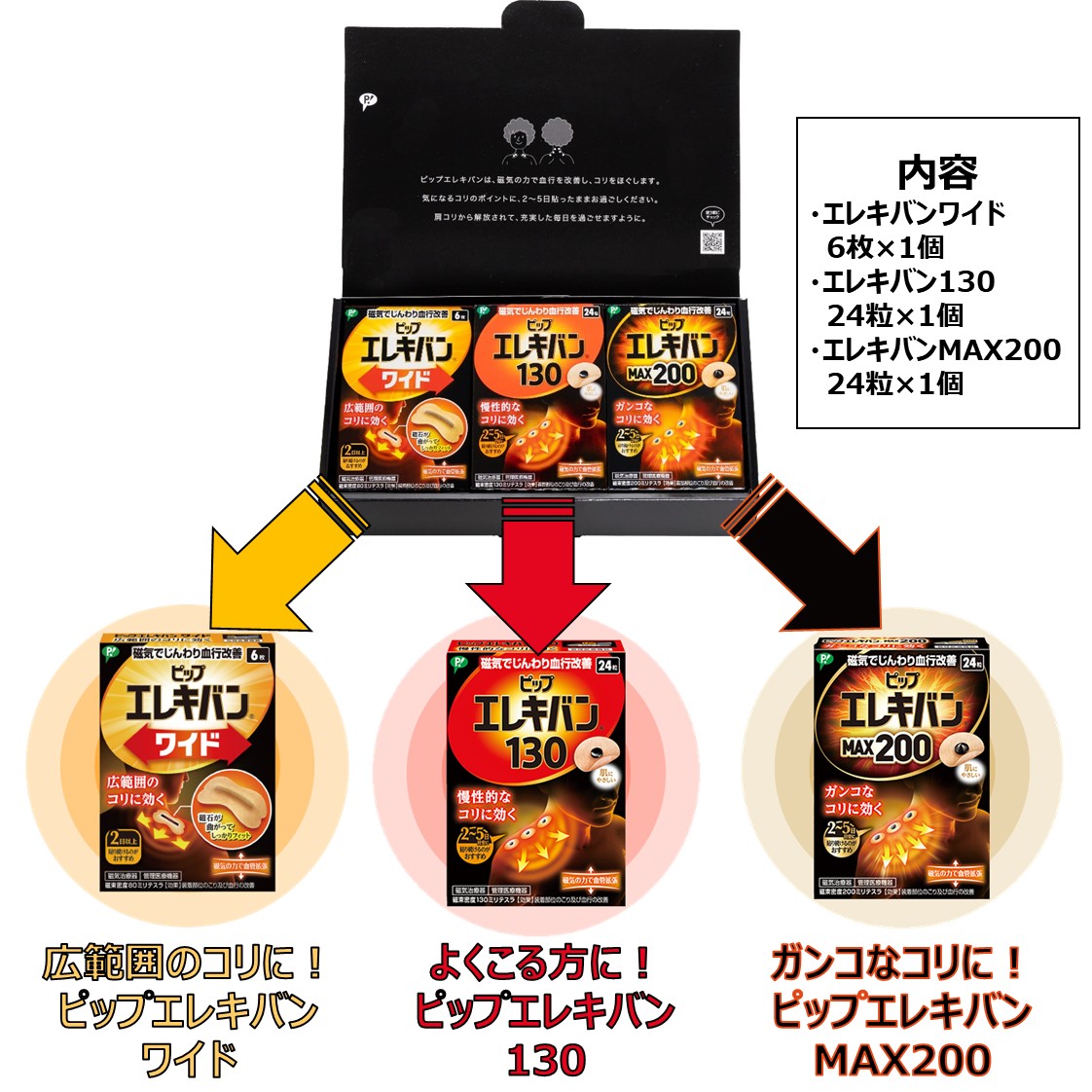 | 入数・内容量ほか | ピップエレキバンワイド6枚×1個 ピップエレキバン130 24粒×1個 ピップエレキバンMAX200 24粒×1個 |