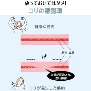 筋肉が緊張して硬くなり、硬くなった筋肉が血管を圧迫し、血流が滞ることで老廃物が蓄積します。 この老廃物が筋肉の神経を刺激してさらに筋肉が緊張し、「コリの悪循環」に陥るのです。