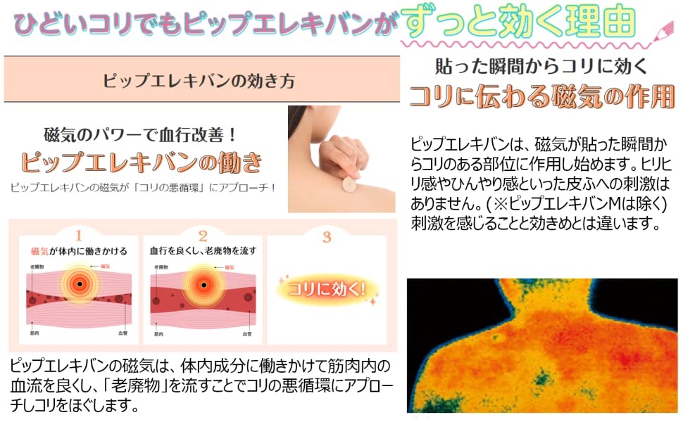 ●コリのある部位に貼ってじんわりほぐす、バンソウコウタイプの磁気治療器です。