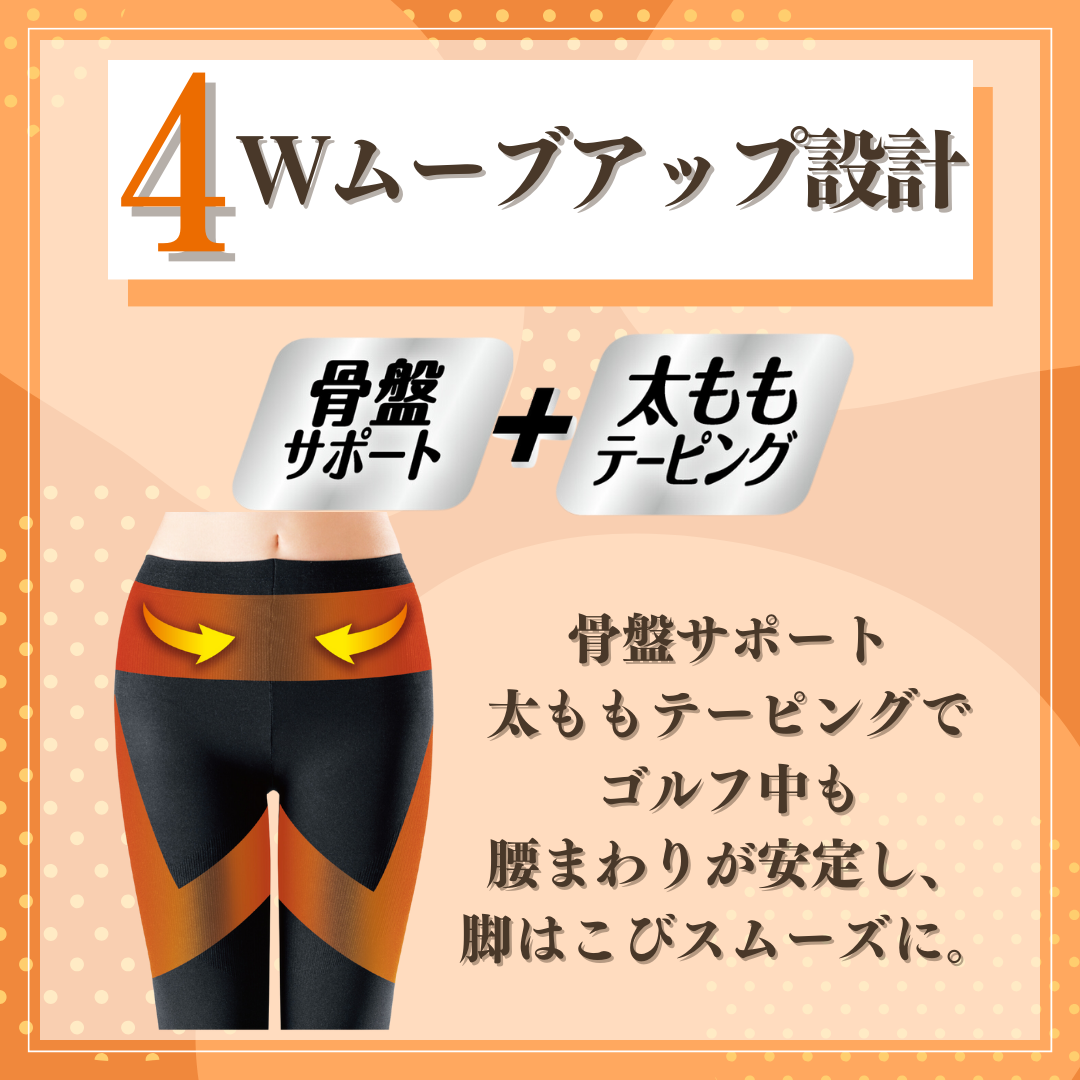 骨盤サポートと、太ももテーピングで、ゴルフ中も腰回りが安定し、脚はこびスムーズに。UVカット+ゴルフ快適素材+オールシーズン着用