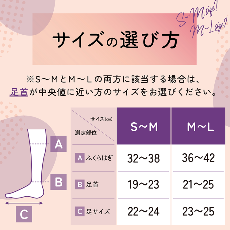 S~MとM~Lサイズの両方に該当する場合は、足首が中央値に近い方のサイズをお選びください。