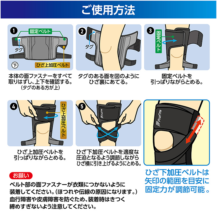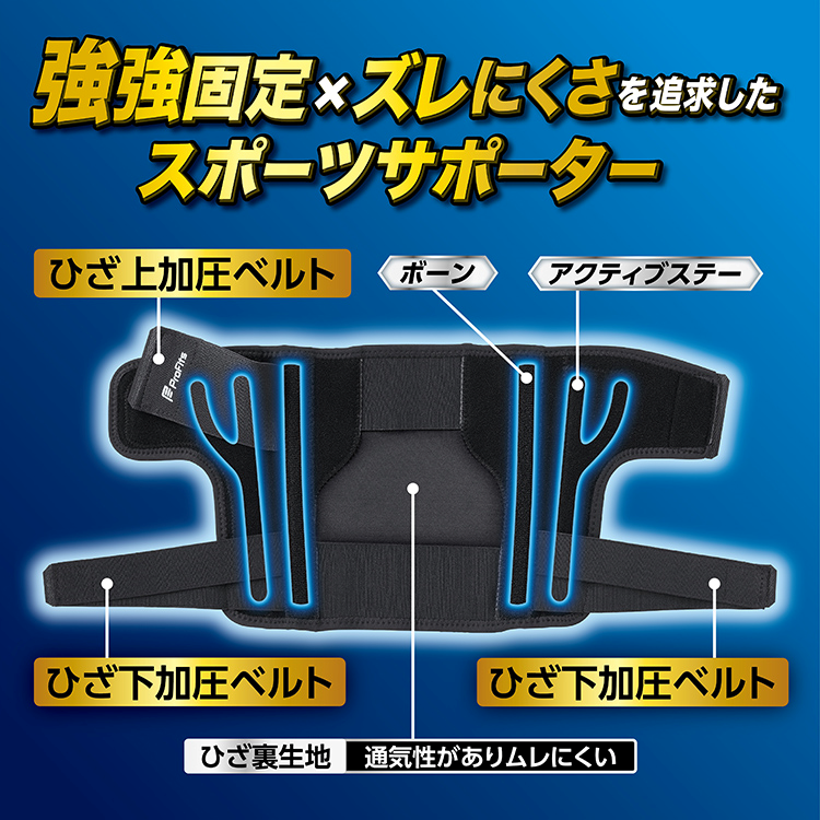 ひざ上、ひざ下の3本の加圧ベルト設計でひざを圧迫固定します。