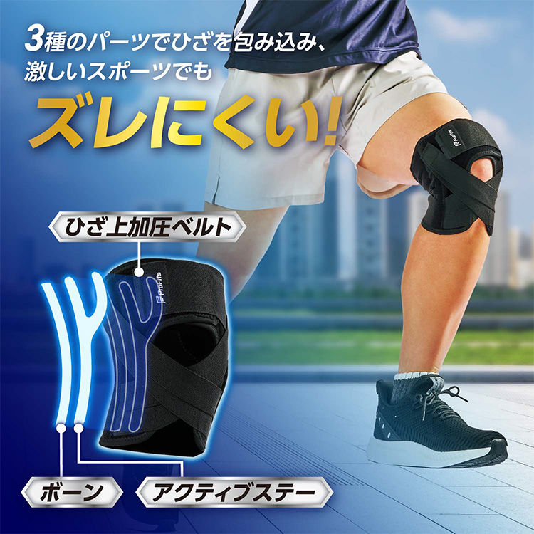 3種のパーツでひざを包み込み、激しいスポーツでもズレにくい設計です。
