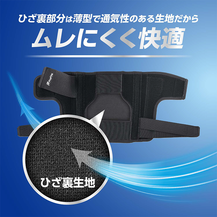 ひざ裏部分は薄型で通気性のある生地を使用しています。
