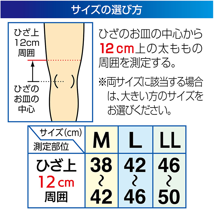 ひざのお皿の中心から12cm上の太ももの周囲を測定する。※両サイズに該当する場合は、大きい方のサイズをお選びください。